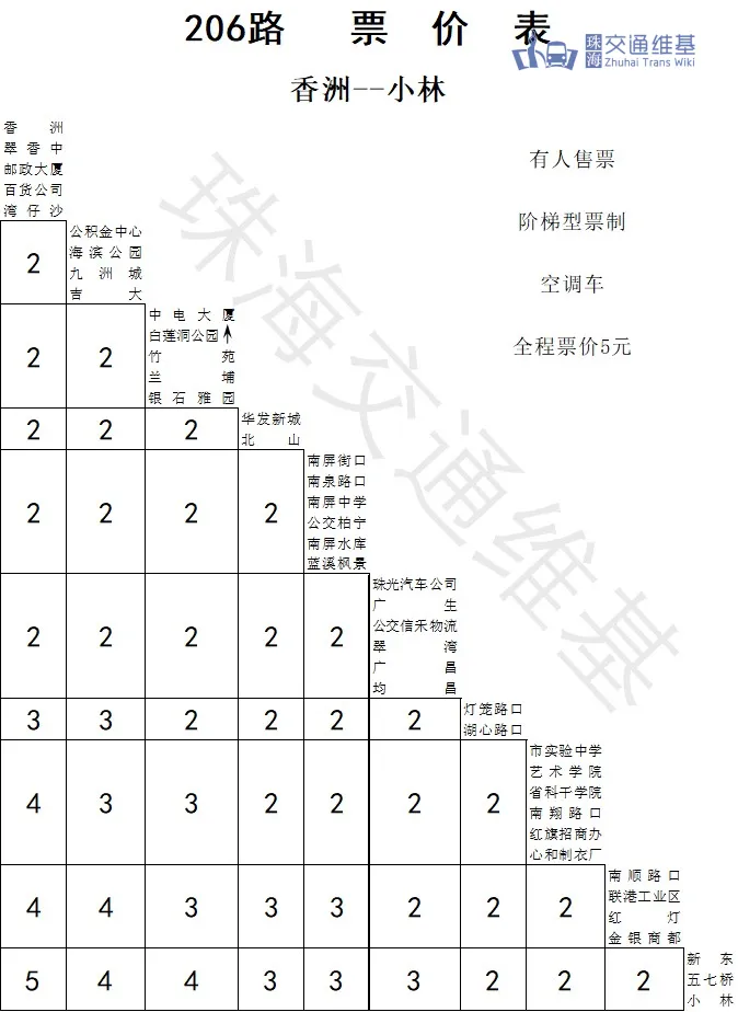 | 香洲 -206- 小林 票价表 |