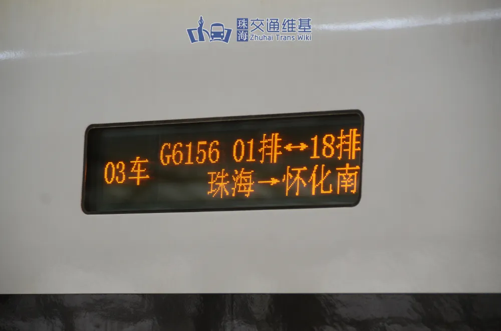 目前,珠海-长沙南(岳阳东)G6107/8次列车、珠海-南通G1301/4/3/2次列车及珠海-深圳北G6333/6/5/4次列车由本车型担当。此外,除G337/8次外,其余珠海始发终到的“G”字头高铁列车也有机会由本车型担当。