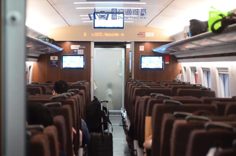 - 1号车厢为商务座车厢,16号车厢为一等座/商务座合造车,2号车厢及15号车厢为一等座车厢,5号车厢为二等座车/餐车合造车,车厢的一端设有吧台。
