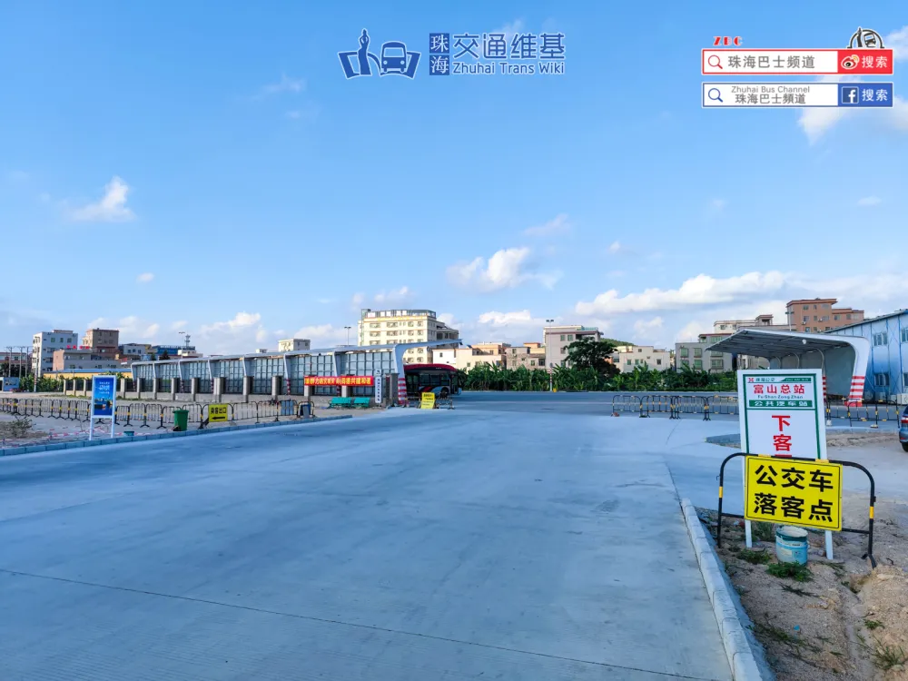 富山总站位于高栏港高速辅路,承接原“五山沙龙”站及“富山工业园”站始发站的功能。站场内配有充电站、办公楼等设施,可为富山片区线路提供充电、夜间停场及车辆交班、维修、调度等服务。