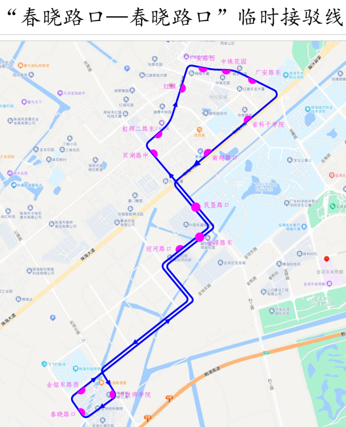 | 春晓路口临时接驳线线路图(转自珠海公交巴士官方微博) |