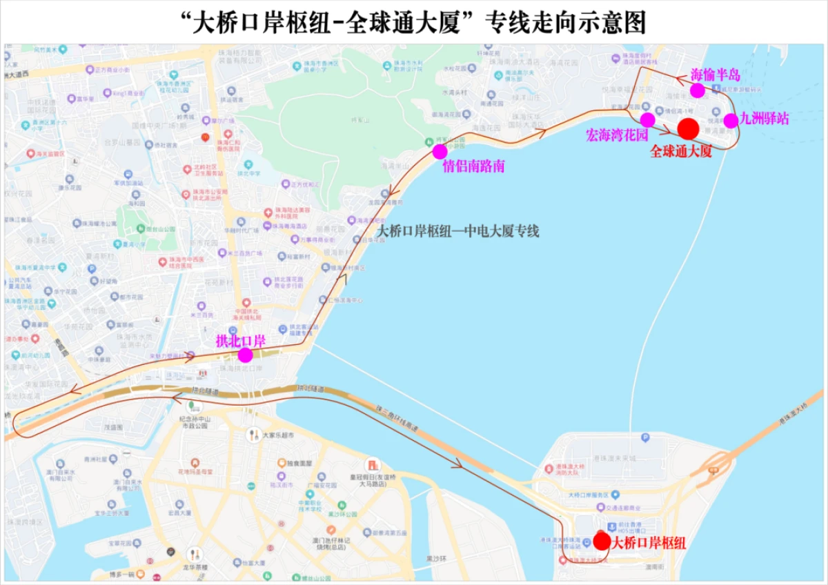 | 主要途经 | 拱北口岸、全球通大厦、海愉半岛、宏海湾花园 |