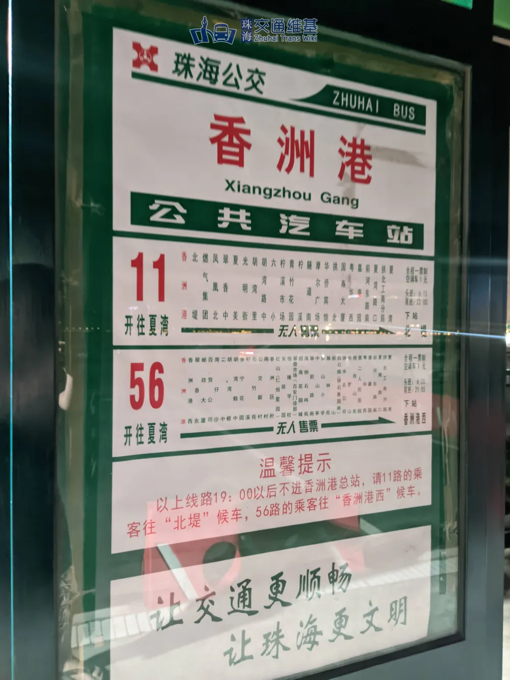 - 早于2019年,香洲港已开通夜班航线,并改造24小时停车场自动卡口,而11路、56路至今为止晚上仍不进本站。