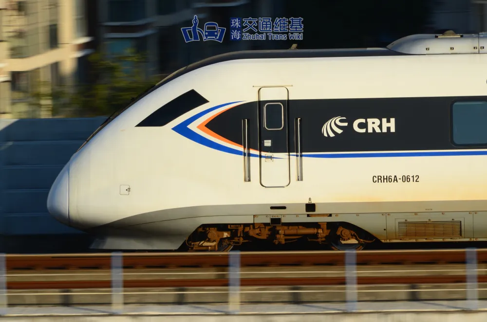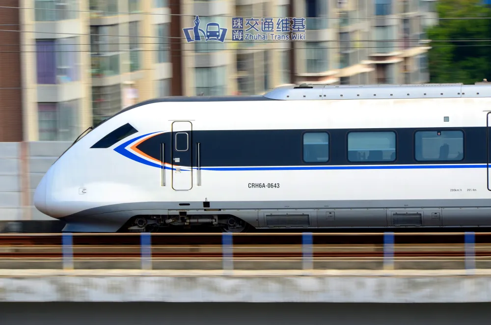 CRH6A,是目前广珠城际的主力车型。制造时采用轻量化铝合金车体、大轴转向架、变频变压牵引控制、电空复合制动等核心技术,拥有优异的启停加速性能和超员能力,十分适合担当城际列车。全车8辆编组,长201.4m,车门宽1.1m,最高运用速度为200km/h。根据内饰不同又可分为分为“普通版”和“舒适版”两类。不具备重联载客运行的能力。