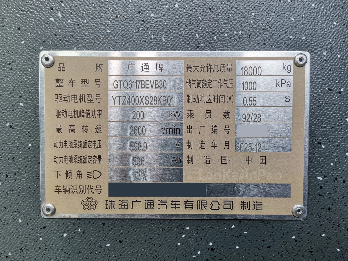 广通GTQ6117BEVB30,是珠海公交巴士有限公司于2025年大批量引进的10米级别的纯电动城市公交车,由珠海广通汽车有限公司制造。