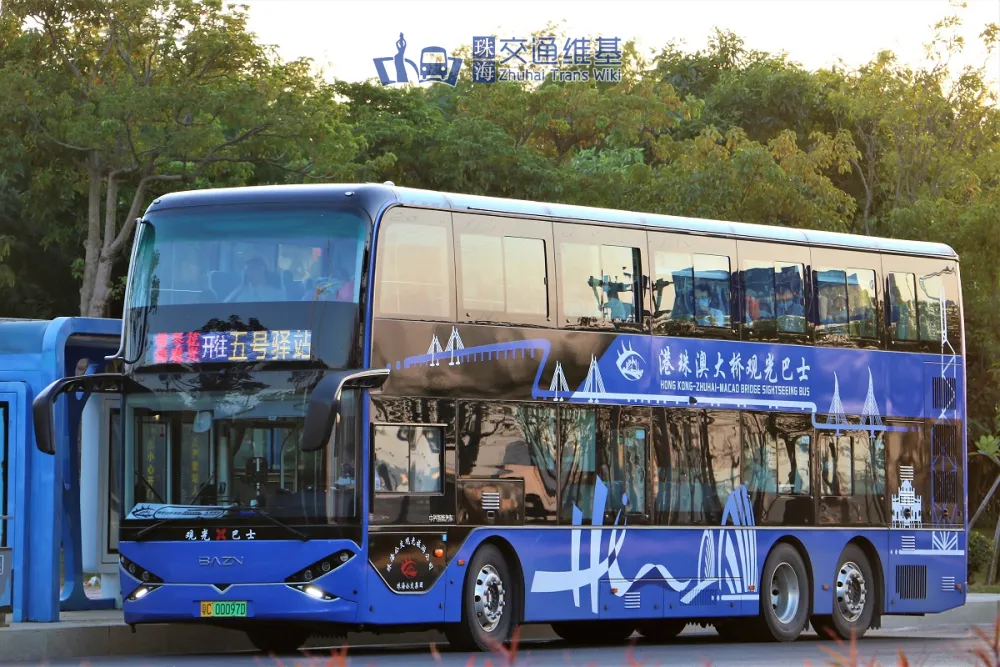 - 第一批次涂装除了珠海城市形象LOGO、日月贝以及港珠澳大桥外,还融合了中银大厦、大三巴牌坊等港澳标志性建筑,并在车身标有“港珠澳大桥观光巴士”中英文标识。