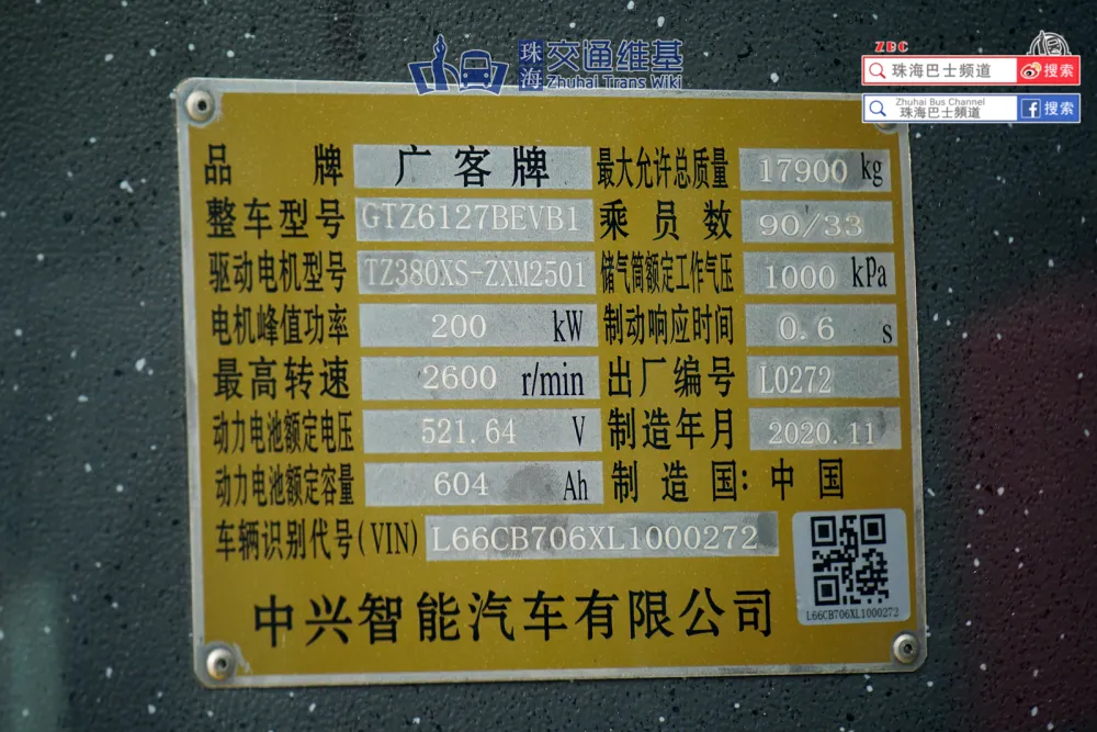 广客GTZ6127BEVB1,是珠海公交巴士有限公司于2021年至2022年分批引进的12米级别纯电动城市公交车,由中兴智能汽车有限公司制造。